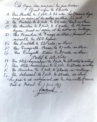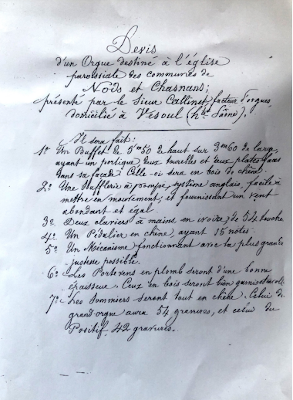 Devis très aimablement communiqué par Marcel Bouveresse, titulaire de l’orgue (retrouvé aux archives municipales de Nods).
