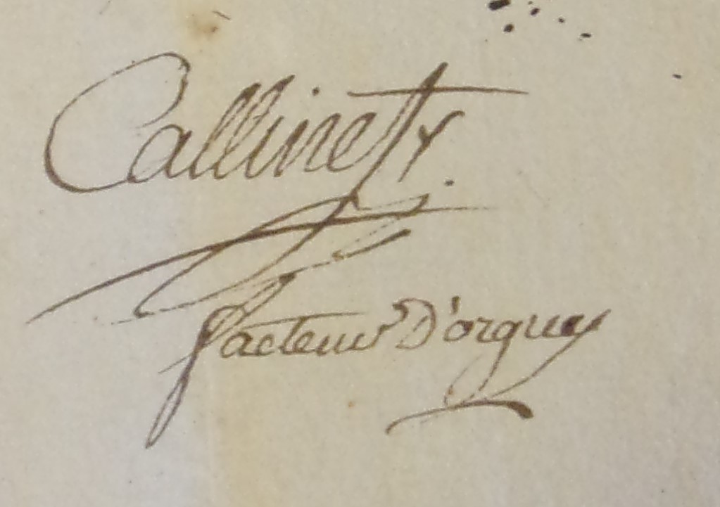 Signature de Claude-Ignace Callinet lors de la commande de l’orgue de l’église Saint-Martin des chaprais à Besançon