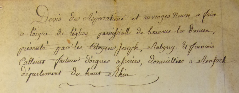 “Devis des réparations et ouvrages neuve à faire à l’orgue de l’église paroifsialle de beaume les dames”